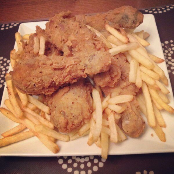 3. Make chip shop batter ( not too thick) and add chicken fry mix. Deep fry. Serve with chips!