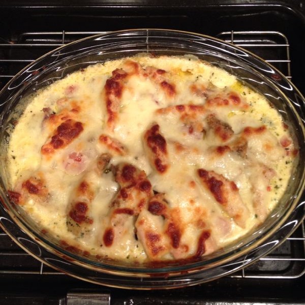 4. In a separate bowl make a cream sauce by mixing together single cream, a little bit of green chillies and black pepper. Pour over the chicken.
