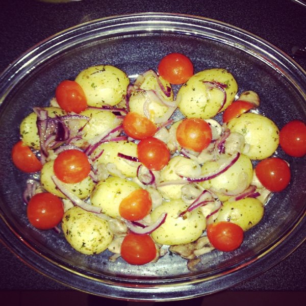 1. Scatter your new potatoes and cherry tomatoes in a casserole dish. Sprinkle over some dry herbs.