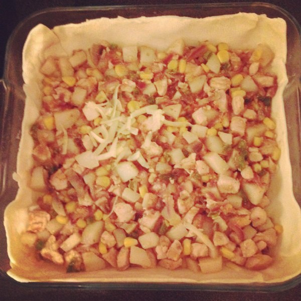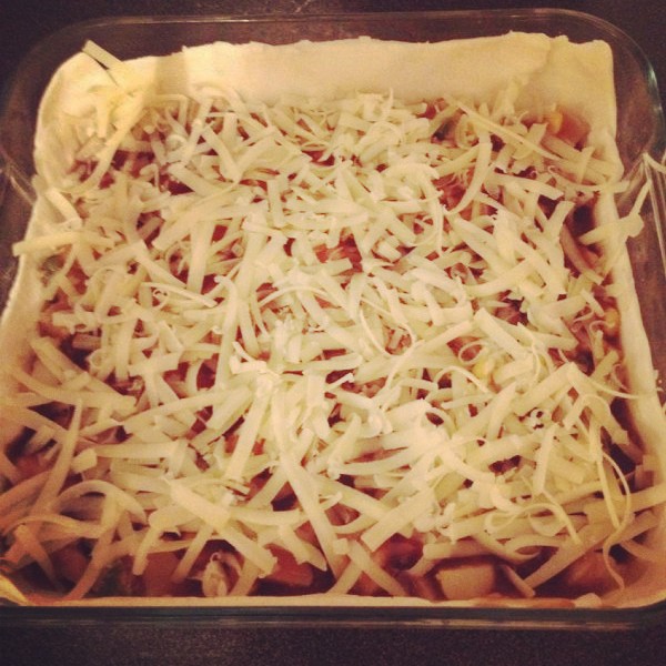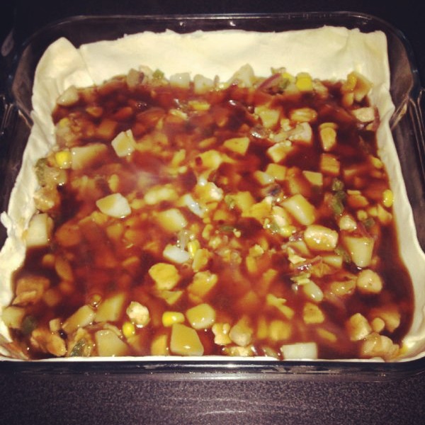 4. Then place a layer of pastry in an oven-proof dish and sprinkle with grated cheese. Add the pie mixture, pour the gravy on top, add the remaining cheese the seal with pastry.