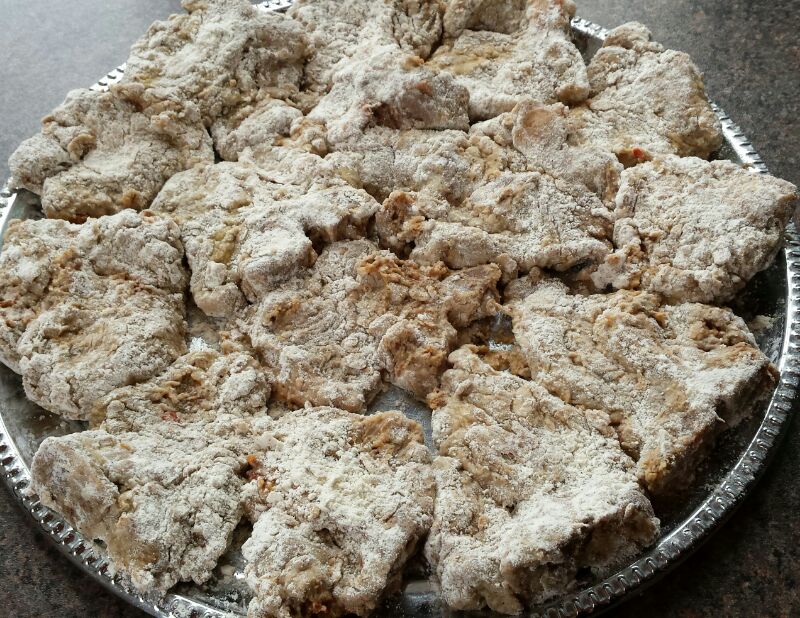 2. Spread pieces of the bread onto the bottom of a dish and sprinkle over half the red peppers and herbs (parsley and coriander).