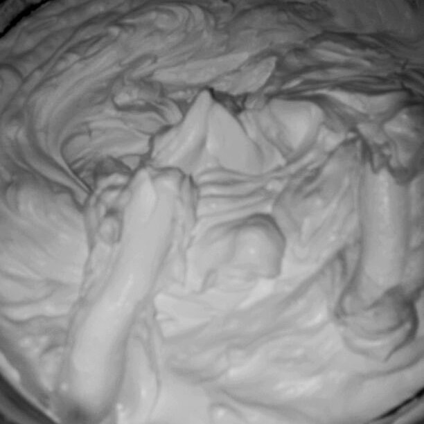 5. Then place the squashed raspberries, cream cheese, 1 heaped tbspn of nutella, the cream frosting from inside the biscuits and sifted icing sugar into a bowl and whisk till well blended. Then add just over half a tub of double cream and whip some more till thick.