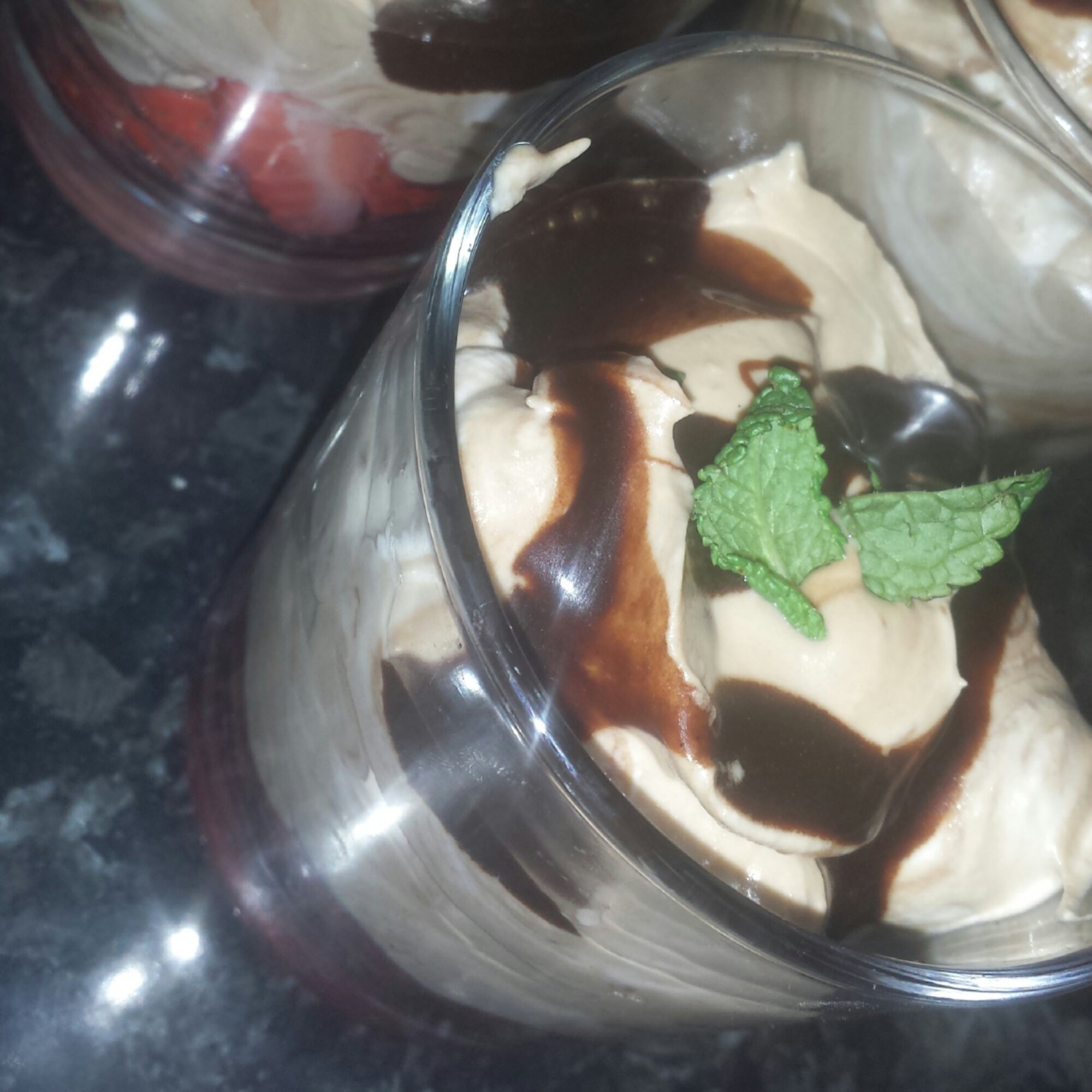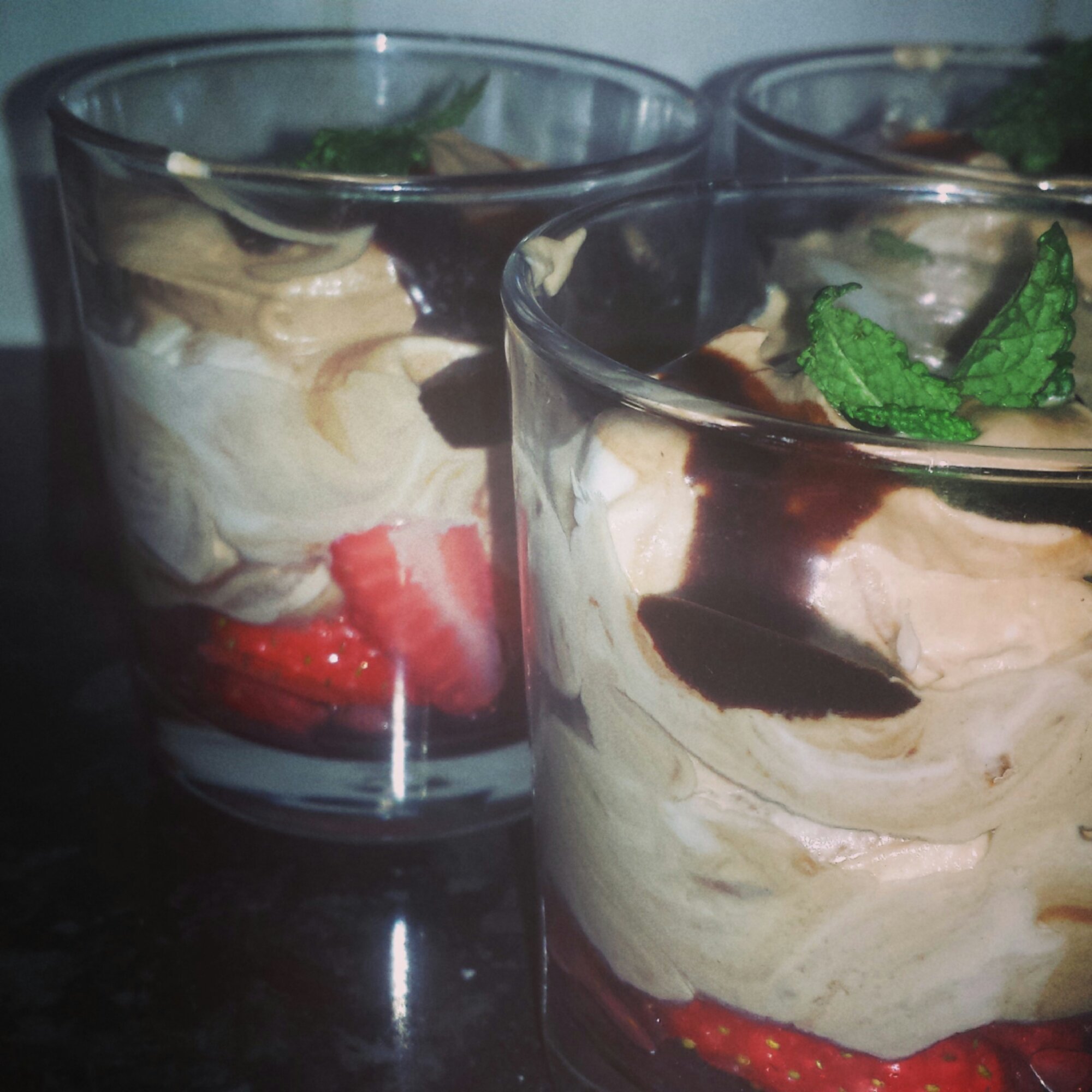9. Spoon over the strawberries. Roughly three large tablespoons of mouse per a glass.