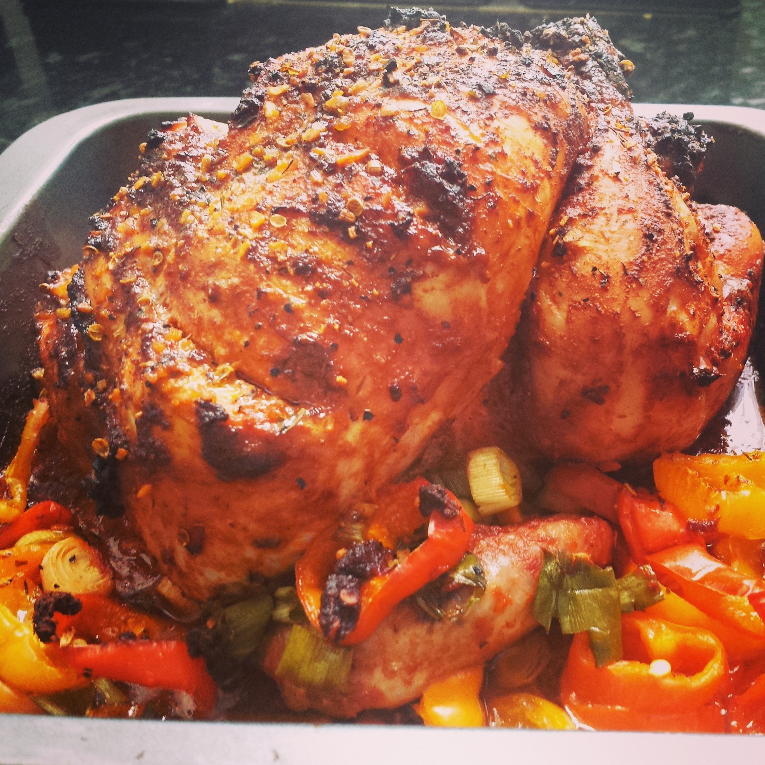 4. Place the chicken in the oven for about 1 hour and 15 minutes. Do not cover. Make the spiced butter again and every 15 minutes to half an hour, take out the chicken and brush it over the whole chicken. Sprinkle a tiny bit of Nandos chicken rub on top each time.